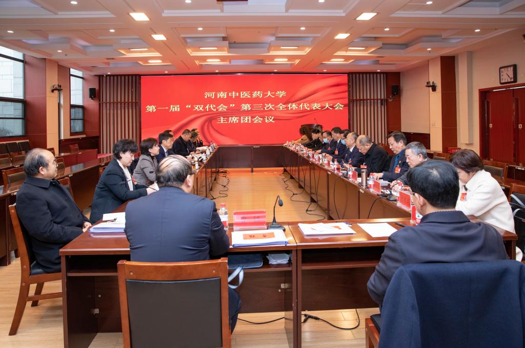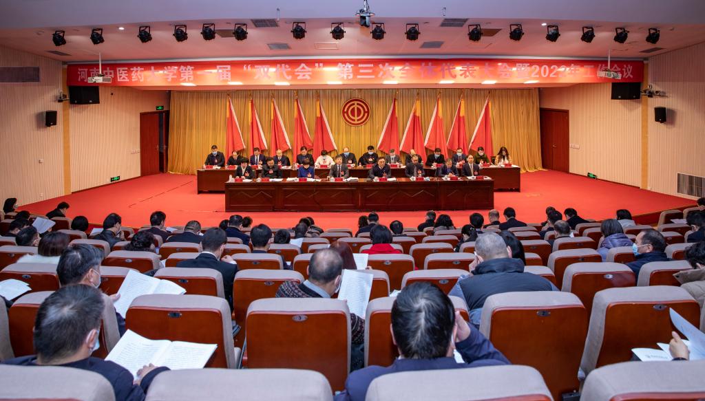 会上,校长许二平作了题为《守正创新担当作为 奋力开创学校高质量发展新局面》的工作报告。许二平表示,2021年是中国共产党成立100周年,学校坚持以习近平新时代中国特色社会主义思想为指引,认真贯彻落实习近平总书记重要指示精神,按照省委、省政府各项决策部署,团结带领全校师生把党史学习教育与攻坚克难、干事创业结合起来,有力推动了各项事业高质量发展。一是全面深化党建引领,汇聚发展合力。学校党委坚持以首位意识推进政治建设,深入开展学习教育,筑牢守好意识形态阵地,不断夯实基层党组织和干部队伍建设,多措并举做好统一战线工作,扎实推进党风廉政建设和作风建设,全面落实新时代党的建设总要求,不断提升党建工作质量,为推动学校各项事业高质量发展提供坚强引领和保障。二是坚决提高政治站位,砺炼发展能力。学校党委坚持发挥领导班子核心作用,讲政治、顾大局,把对党的绝对忠诚落实到敢于担难担险和服务发展大局中:以书院制改革为抓手推动落实根本任务、科学制定“十四五”发展规划和2035年远景目标、站位“高”,行动“快”,责任“实”,工作“细”,持续抓牢疫情防控、凝聚力量抗汛救灾,经受住了突发事件对学校治理体系治理能力的检验,有效衔接巩固脱贫攻坚成果与助力乡村振兴,取得了显著成绩。三是准确把握形势任务,争取发展主动。学校聚焦贯彻落实党中央和省委的新部署新要求,准确把握新形势新任务,积极谋划、主动融入新发展格局。认真贯彻落实习近平总书记视察南阳对中医药作出的重要指示精神,通过学习、宣传、调研等举措在全校迅速掀起学习贯彻热潮,探索传承创新发展路径;通过积极布局人才培养、学科、科研评价等体系的重构,打造中医药服务和文化传承新高地,助推中医药强省建设。积极融入创新驱动发展战略,服务现代化河南建设,进一步把思想、行动统一到省委的部署要求上来,紧跟省委部署、明确目标定位、积极争创“双一流”,在不断强化创新引领、扛牢立德树人根本任务、推动中医药传承创新发展、提升全方位全周期健康服务水平、全面启动“双一流”创建工作等方面集中发力,成效显著。四是扎实推进内涵建设,保持发展势头。2021年,学校坚定走好内涵式发展道路,有力推动了学校转型发展进入新阶段:人才培养质量有新提升、学科发展水平持续提高、科学研究取得新突破、师资队伍建设不断加强、社会服务体系更加完善、国际合作交流合作深入拓展、治理能力和基础能力稳步提升。