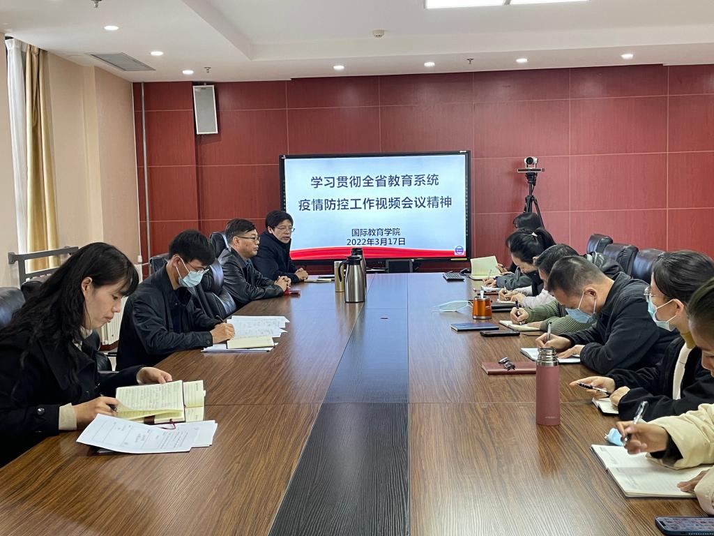 本网讯(文图/孙珠珊)为认真落实全省教育系统疫情防控工作视频会议和学校疫情防控工作会议精神,切实做好国际教育学院疫情防控工作,2022年3月17日上午,国际教育学院在6号楼1101会议室召开疫情防控工作专题会议,国际教育学院领导班子与全体教职工参加本次会议。