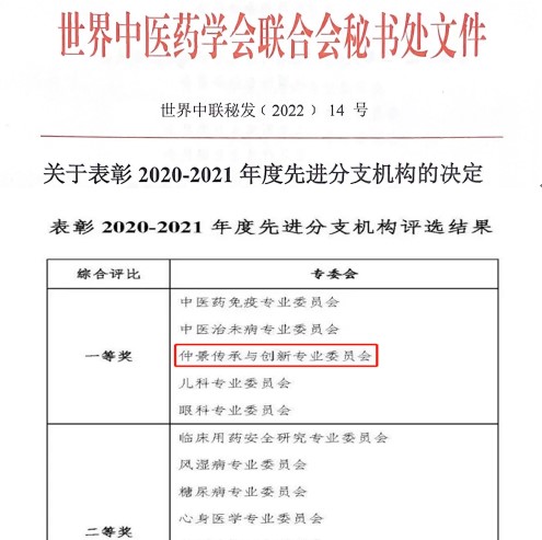 本网讯(文图/柳忠勇)近日,世界中医药学会联合会(以下简称“世界中联”)发布了关于表彰2020-2021年度先进分支机构的决定(世界中联秘发〔2022〕14号),对表现优异的分支机构进行表彰。由米兰(中国)作为依托单位,校长许二平任会长的世界中联仲景传承与创新专业委员会获综合评比一等奖。