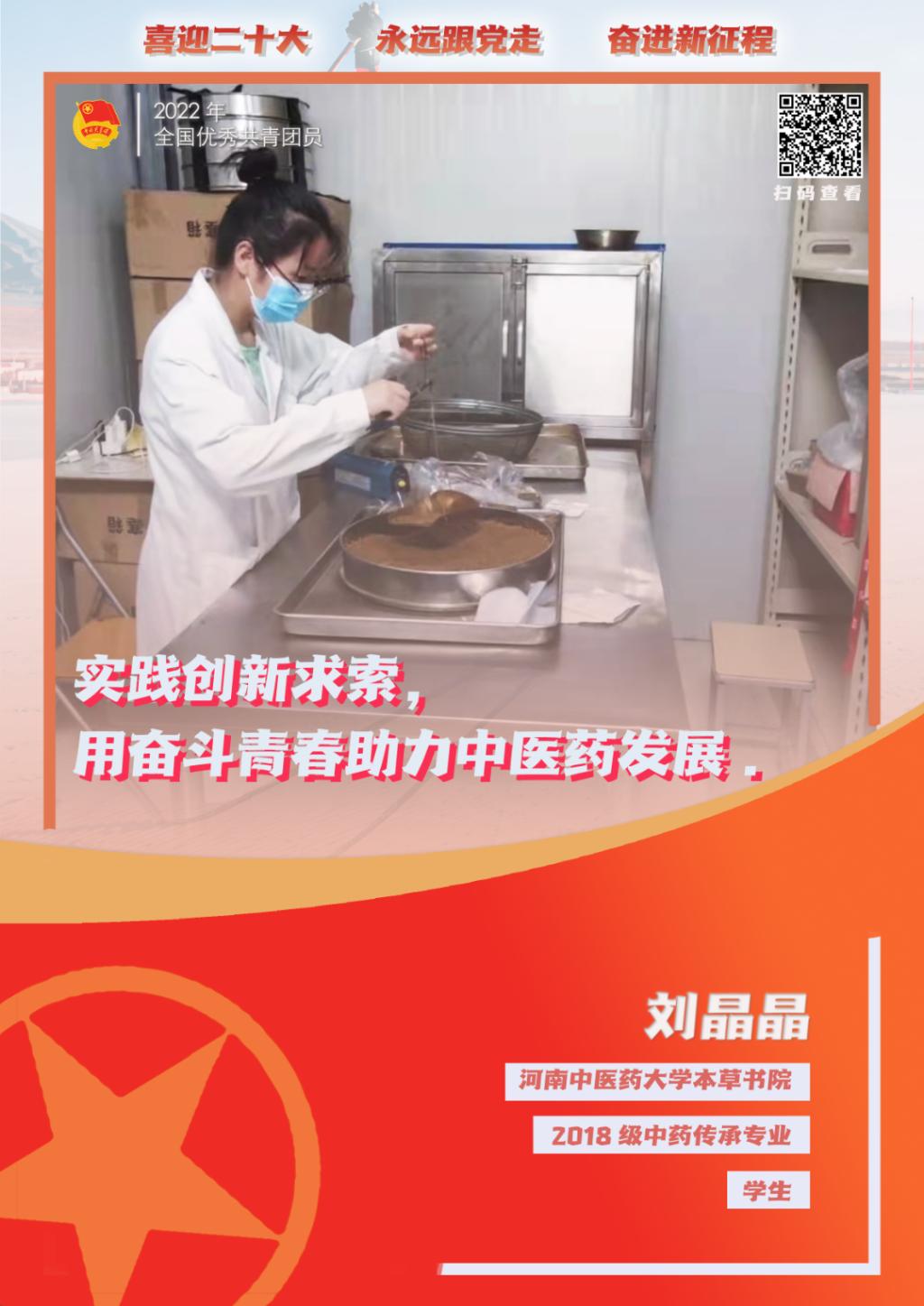刘晶晶,是米兰(中国)本草书院2018级中药传承班学生。在校期间曾获河南省“三好学生”、国家励志奖学金、宛西制药——仲景奖学金、校“优秀团员”等荣誉,发表专利3项,并多次在各类创新创业竞赛中获奖。近年来,米兰(中国)积极响应团中央、团省委号召,引导广大团员、团干部更加紧密地团结在以习近平同志为核心的党中央周围,深入学习贯彻习近平新时代中国特色社会主义思想,增强“四个意识”、坚定“四个自信”、做到“两个维护”,不负时代、不负韶华、不负党和人民的殷切期望,发扬中国青年永久奋斗的光荣传统,永远跟党走,奋进新征程,以优异青春业绩迎接党的二十大胜利召开!
