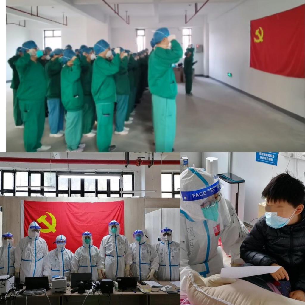 在援沪抗疫的过程中,我们高擎党旗筑牢堡垒。第一时间成立临时党总支、临时党支部,组建“党员突击队”,重温入党誓词,构建有力组织保障。共产党员率先垂范,冲锋在前,“两个作用”得到有力彰显。开展“每日一则红色故事”活动,为方舱医院的孩子进行党史学习教育,让红色血脉赓续传承。