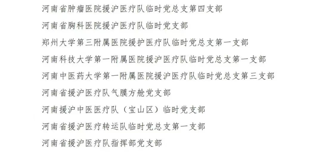 一附院崔青荣、梁浩卫等12名同志,二附院温世宝、牛朝阳等8名同志,三附院胡兴旺获“优秀共产党员”称号;一附院乔东鸽、曹方等4名同志,二附院胡仕祥、杜旭召获“优秀党务工作者”称号;一附院援沪医疗队临时党总支第三支部、二附院河南援沪中医医疗队临时党支部获“先进党组织”称号。