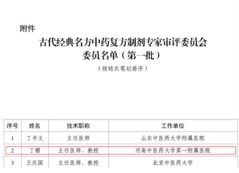 本网讯(文图/梁楠)近日,国家药监局药审中心网站发布《古代经典名方中药复方制剂专家审评委员会委员名单(第一批)》,河南省共有五位专家入选,其中四位都来自一附院,分别为:丁樱教授、朱明军教授、李素云教授和赵文霞教授。