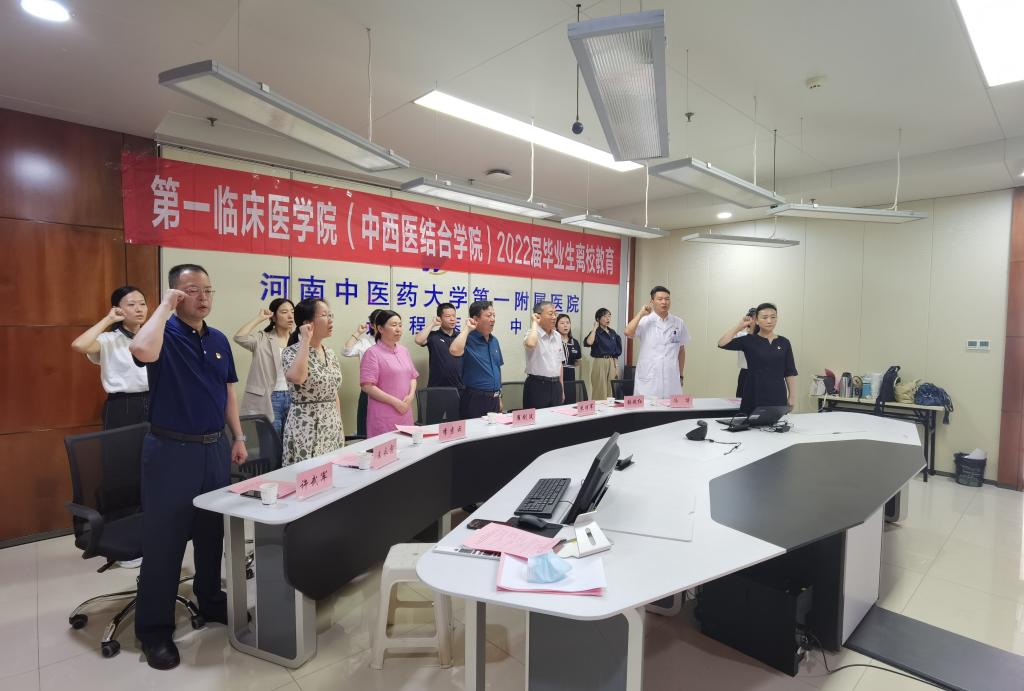 本网讯(文/程丽娟 图/李新宇)栀子花开时,夏荷正飘香。2022年6月2日上午,第一临床医学院(中西医结合学院)在医院基地楼15楼远程会诊中心隆重举办2022届毕业生离校教育暨最后一课《誓言》活动。医院党委书记翟剑波、党委副书记、院长朱明军、执行院长李素云、党委副书记张婉红、副院长王永霞、副院长冯博、党办、学生党总支、学工办、团委等相关辅导员参加,活动由学生党总支书记范璐璐主持。