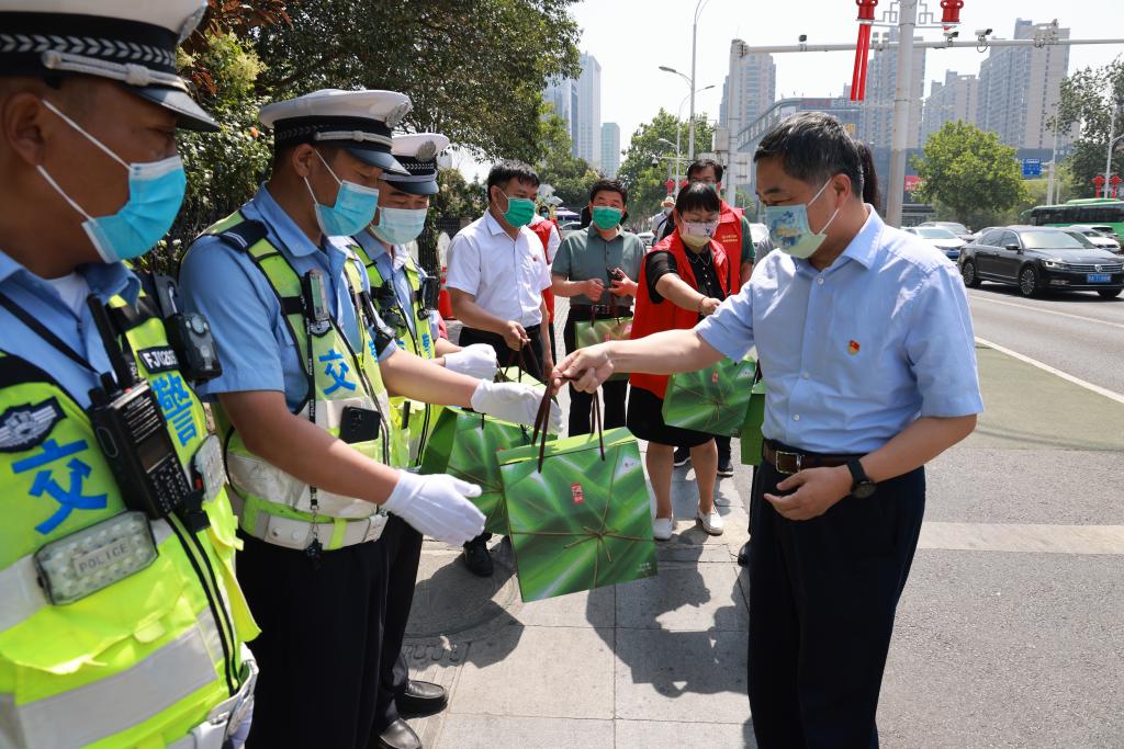 2022年6月2日上午,院领导带领医院职工、志愿者来到金水路东明路交叉口的交警执勤点,向执勤的交警同志送上粽子和医院自制的端午香囊,向在高温条件下依旧坚守路面执勤的交警表示慰问。张大伟表示,交警队员战高温、斗酷暑、冒风雨,以高度的责任心和使命感,无私奉献,认真履职尽责,为保障交通安全畅通作出了巨大贡献。对此,医院向所有交警同志表示崇高敬意,让交警同志在炎炎夏日也能感受到浓浓的传统节日氛围和医护人员的爱心。