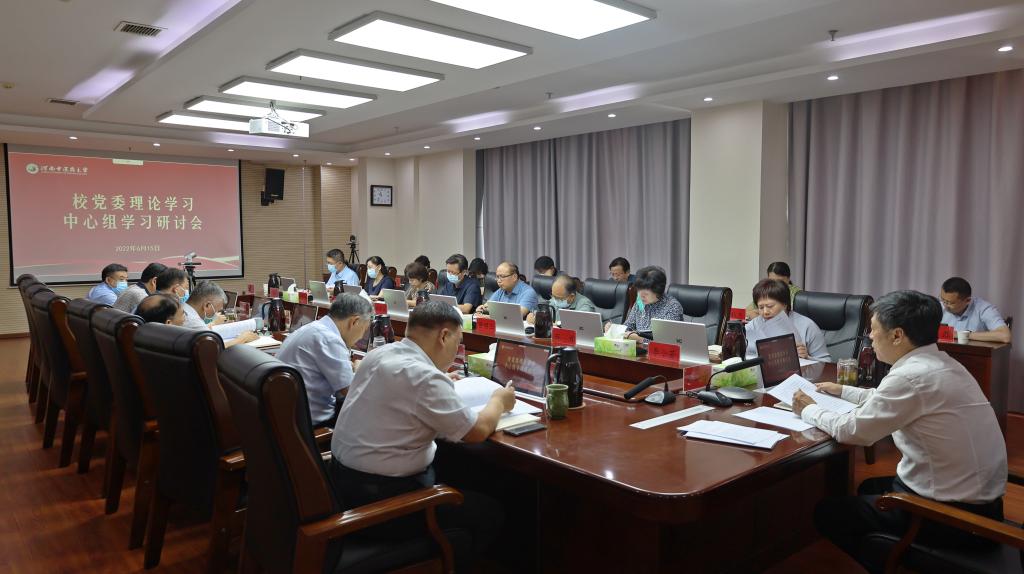 本网讯(文/王赞 图/吴晋一)2022年6月15日上午,校党委理论学习中心组在教学实验综合大楼BS605召开学习研讨会,就《“十四五”中医药发展规划》等内容进行学习交流。会议由校长许二平主持,校党委理论学习中心组全体成员参加。