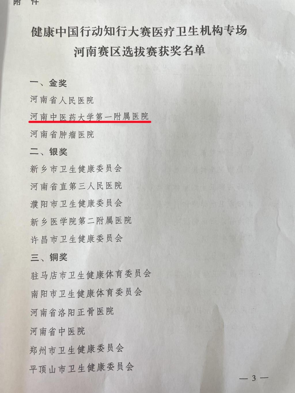 本网讯(文/梁楠)近日,河南省卫健委公布了健康中国行动知行大赛医疗卫生机构专场河南赛区选拔赛获奖名单的通知,一附院荣获本次选拔赛金奖和最佳组织奖。