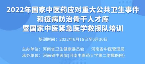 本网讯(文图/赵莉娜)根据《国家中医药管理局关于印发国家中医药应对重大公共卫生事件和疫病防治骨干人才库建设方案的通知》,为提升河南省应对重大公共卫生事件的应急救治能力,进一步加强中医紧急医学救援人才培养和储备,带动各级中医医疗机构综合救治能力提高,二附院作为河南省唯一一家国家中医紧急医学救援队伍及基地依托医院,按照河南省卫健委、河南省中医管理局的统一部署,于2022年6月16日-30日举办国家中医药应对重大公共卫生事件和疫病防治骨干人才暨国家中医紧急医学救援队培训会议。