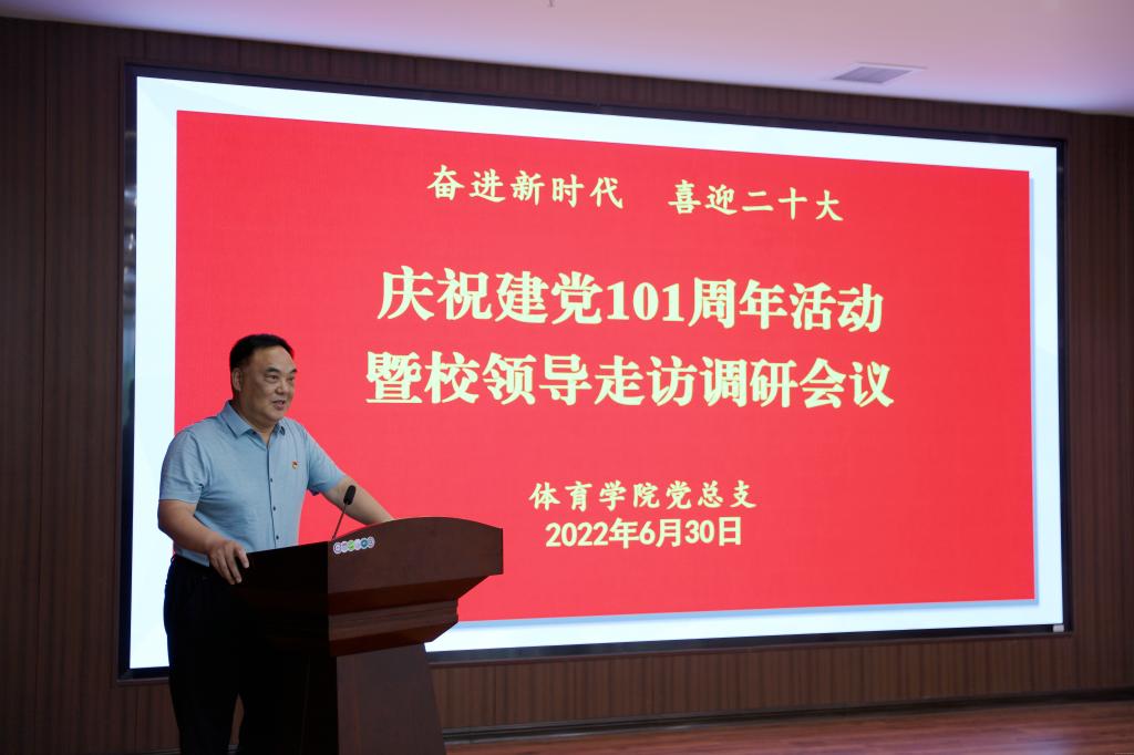 本网讯(文/马琳 图/杜伦)为庆祝中国共产党成立101周年,进一步提升基层党组织凝聚力和战斗力,深入推进“能力作风建设年”活动,2022年6月30日,体育学院党总支开展“奋进新时代 喜迎二十大”庆祝中国共产党成立101周年活动,全体党员参加,校党委副书记、工会主席张小平,副校长司富春出席活动并做讲话。活动由党总支副书记王楠斐主持。