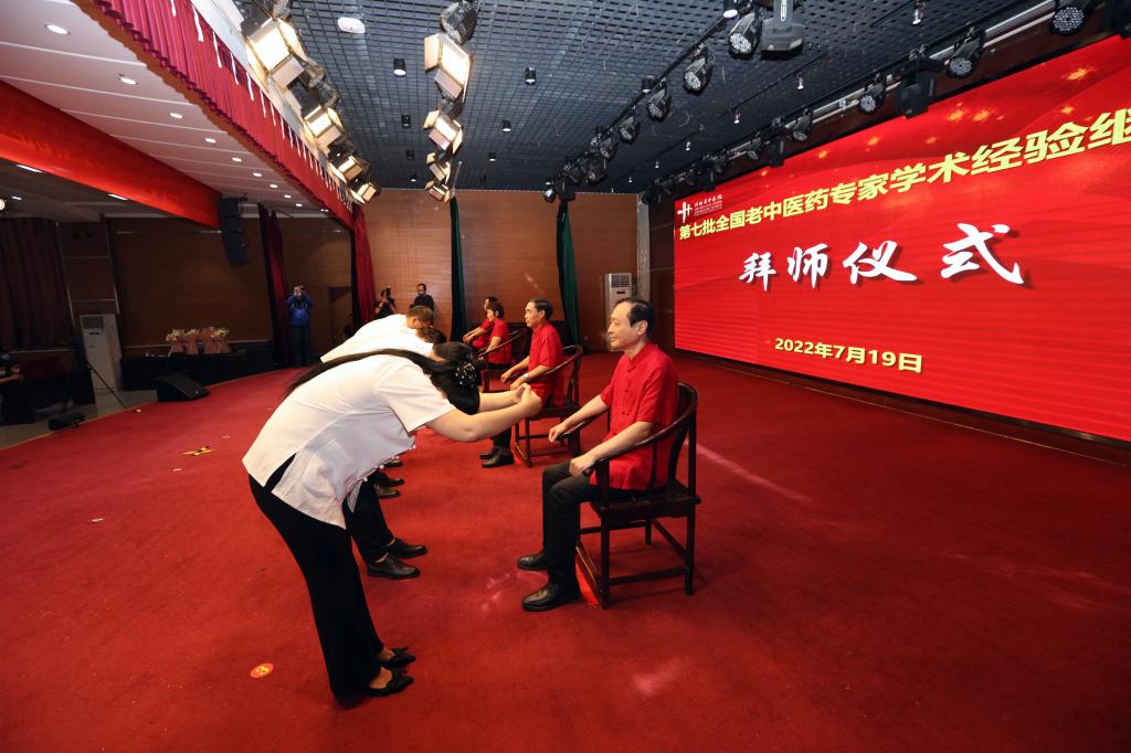 “中医文化,源远流长。大道弘光,惟承惟扬。今有弟子,有志歧黄……”在第七批全国老中医药专家学术经验继承工作拜师仪式、河南省第二批中医药青苗人才拜师仪式上,弟子代表们齐声朗诵拜师帖,誓言“精勤不倦,笃习岐黄道术,立志救人,传承医道精微。”之后,老师走上舞台,盛装端坐于上,慈目注视弟子;弟子躬身行礼、递拜师帖、敬奉香茶谢师;老师授予回徒贴,望弟子秉承师训,勤读经典。当摄影师将这一画面定格时,千年岐黄再续薪火,师徒传承又添佳话。