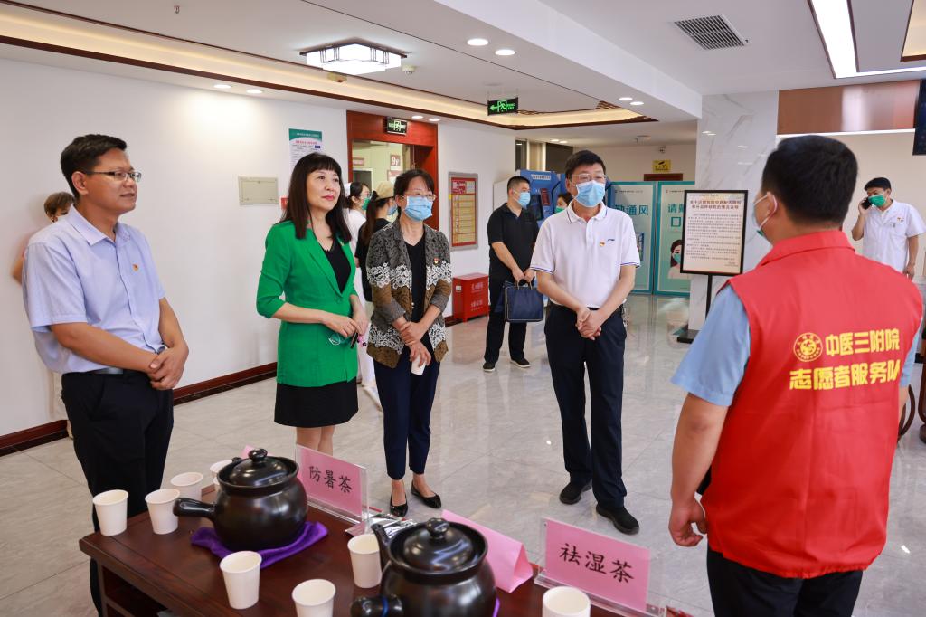 在综合楼9楼国医馆,张学旺一行看到门诊保健办党支部正在举行每月一次的主题党日活动,张学旺与党员志愿者们亲切交谈,听取了支部书记张阳阳的工作汇报,并对门诊保健办党支部结合自身特点擦亮“医心向党,便民就医”党建品牌表示支持与鼓励。在综合楼1106会议室,张学旺认真听取了焦钧关于三附院创建“河南省公立医院党建示范单位”的工作汇报。
