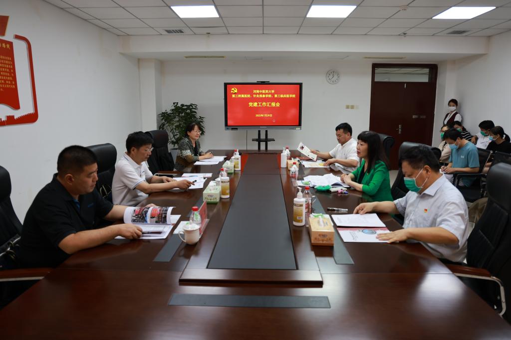 本网讯(文/郑楠楠 图/潘向昆)2022年7月29日上午,河南省卫生健康委员会机关党委专职副书记张学旺,省卫健委机关党委副书记、二级调研员郑越敏,省卫健委机关党委一级主任科员陈鹏到三附院调研指导河南省公立医院党建示范单位创建工作。三附院党委副书记焦钧陪同调研,院纪委书记刘会勋、工会主席蔡庆春、各党总支书记、党委办公室等相关部门负责人参加汇报会。