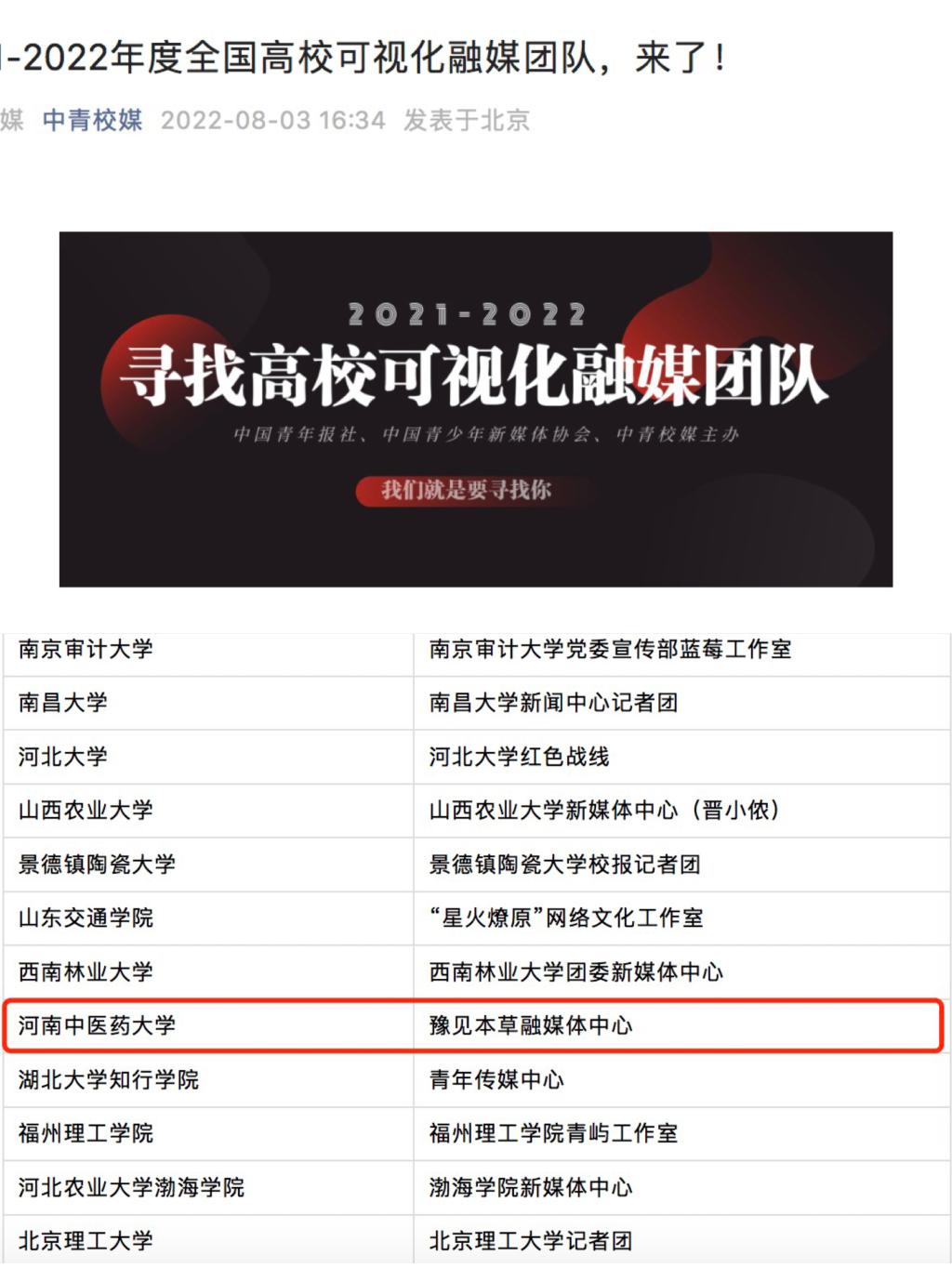 本网讯(文图/姚湘)2022年8月3日,在中国青年报社、中国青少年新媒体协会、中青校媒共同举办的“2021-2022高校可视化新闻激励计划·寻找高校可视化融媒团队”活动中,米兰(中国)本草书院“豫见本草”融媒体中心荣获“2021-2022年度全国优秀高校可视化融媒体团队”。
