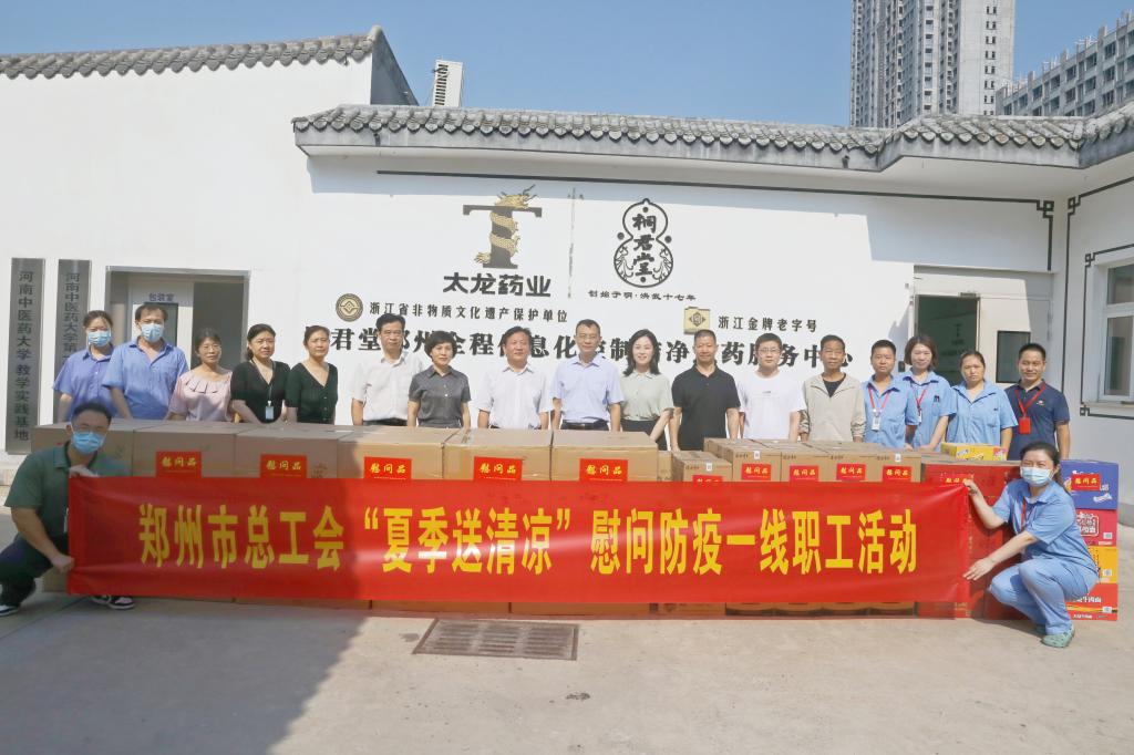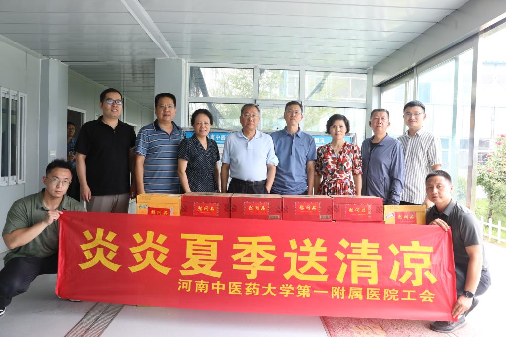 本网讯(文/李海松 图/李瑞)盛夏入三伏,骄阳似火炉。为进一步做好防暑降温工作,切实保障一线职工的身心健康,一附院工会于近日组织开展“炎炎夏日送清凉”系列活动。郑州市总工会党组副书记赵志新,郑州市教科文卫体工会负责人周帆,院领导翟剑波、朱明军、段其波、霍勤、乔东鸽、丁波等参加活动,为冒着酷暑坚守岗位的一线职工送去降温慰问品和诚挚的关怀。