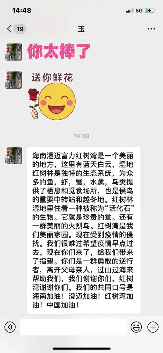 海口市澄迈县红树湾业主阿姨向一附院医疗队队员韩会发来感谢信,邀约疫情结束后再次前往红树湾欣赏美景!看海南的阳光更加明媚,更加灿烂!