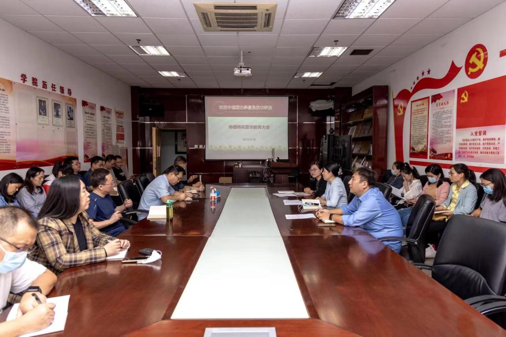 会议要求全体教职工要提高政治站位,深入贯彻落实习近平总书记关于新时代教师队伍师德师风建设的重要论述,争做“四有”好老师,努力成为新时代的大先生。要加强学习,广泛宣传先进典型事迹,充分发挥先进模范人物的引领示范作用。要以教师职业行为十项准则典型案例为鉴,深刻汲取案例教训,认真进行自我审视,警钟长鸣,严以律己,做一名无愧于初心使命,无愧于党和人民的高校教师对违反师德师风的现象“一票否决”。