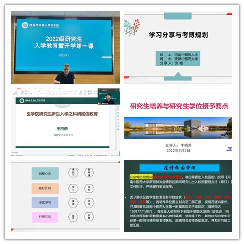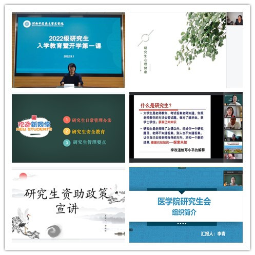本网讯(文/图孙慧娟)为加强研究生思想政治教育工作,引领研究生厚植爱党爱国情怀,引导研究生尽快适应学习、科研环境,2022年9月1日至2日,在学校研工部、研究生院统一部署下,医学院科学谋划、精心组织,集中开展十场专题入学教育活动,内容包括“理想信念与思想引领”“校史院情与爱校荣校”“学业规划与职业发展”“科学道德与学术诚信”“教学培养与学位要求”“心理健康与安全法纪”等,涵盖了与研究生科研、学习和生活息息相关的各个方面,助力研究生新生开启求学问道新征程,踏实走好每一步。