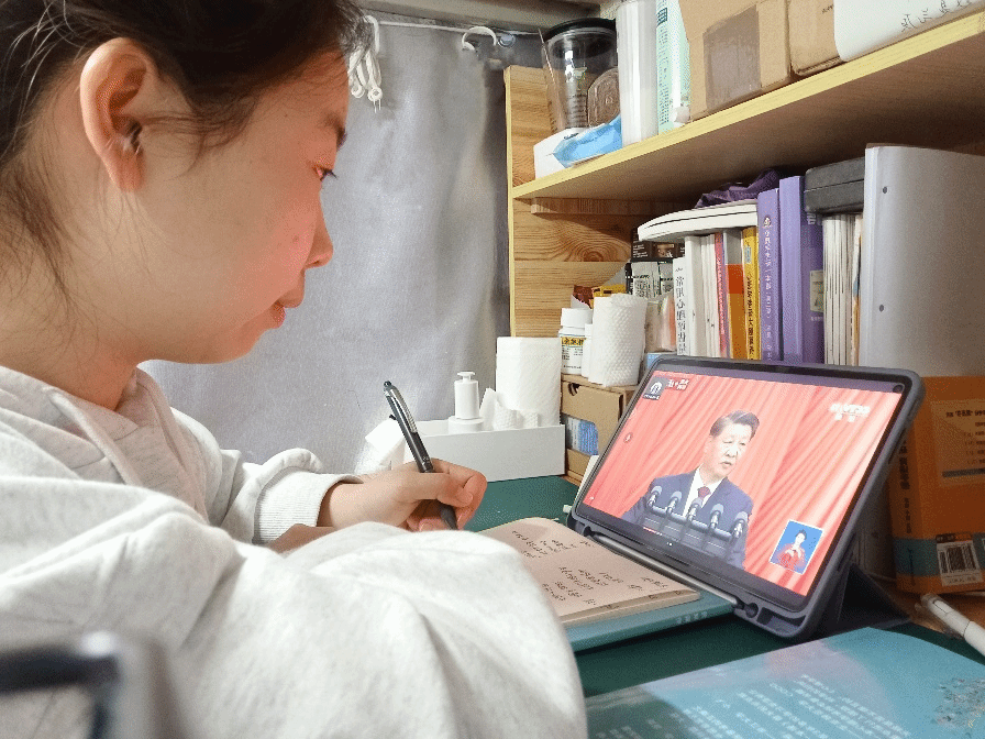 我通过网络直播认真观看了大会盛况,倍感振奋,心潮澎湃。伟大成就鼓舞人心,宏伟蓝图催人奋进。作为一名新时代青年,我要牢记习近平总书记的嘱托,坚定不移听党话、跟党走,成为有理想、敢担当、能吃苦、肯奋斗的新时代好青年。作为一名中医学子,努力学习、勤于钻研,待学有所成后,到祖国最需要的地方建功立业,为推进健康中国建设、促进中医药传承创新发展贡献青春力量。