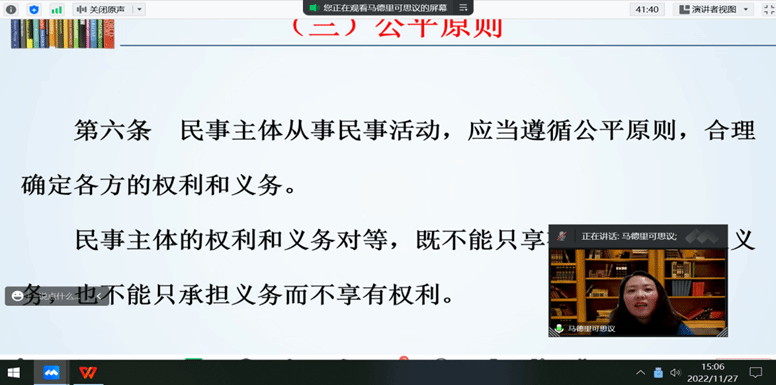 《中华人民共和国民法典》是新中国第一部以法典命名的法律,被誉为“社会生活的百科全书”。周会蕾博士结合党的二十大报告“坚持全面依法治国,推进法治中国建设”内容,首先阐述了编纂《中华人民共和国民法典》的重大意义,接着对《民法典》的基本原则进行了详细解读,最后从微观出发,采取“以案释法”的方式对关涉大学生生活的法条进行了具体讲解,引导大学生深刻认识到《民法典》既是保护自身权益的法典,也是必须遵循的行为规范。