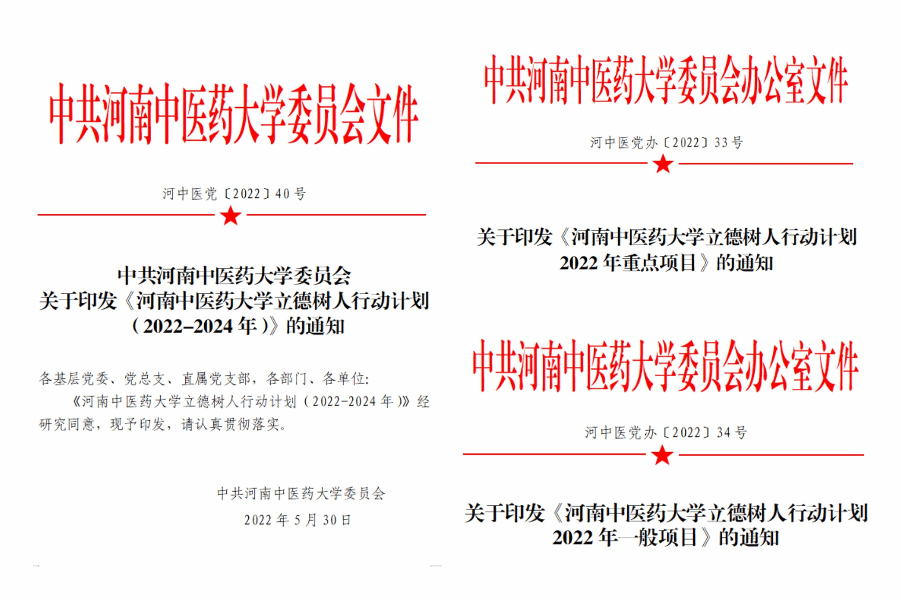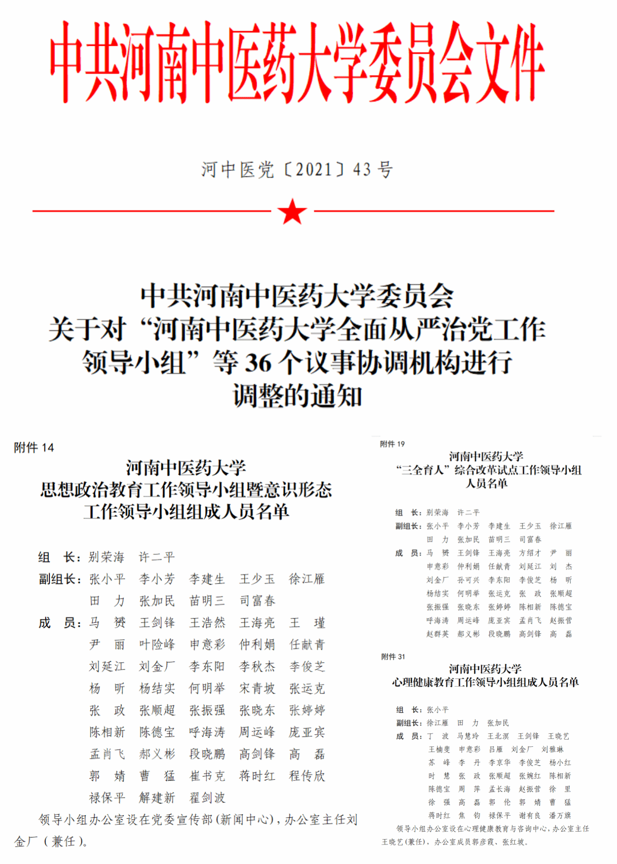 (一)强化组织领导,坚定“主心骨”。校党委扛牢为党育人、为国育才的使命担当,不断提高政治站位,增强行动自觉。学校成立由党委书记、校长任组长,主管副书记任常务副组长,其他校领导任副组长,各部门各单位负责人为成员的思想政治教育工作领导小组。根据形势任务需要,及时成立三全育人、中医药特色文化建设、心理健康教育、立德树人等工作领导小组,不断拓展工作领域,统筹育人力量,构建了党委统一领导、党政齐抓共管、职能部门协同推动、基层学院(书院)积极落实的常态化与长效化工作机制。2018年,学校成为首批河南省“三全育人”综合改革试点高校。