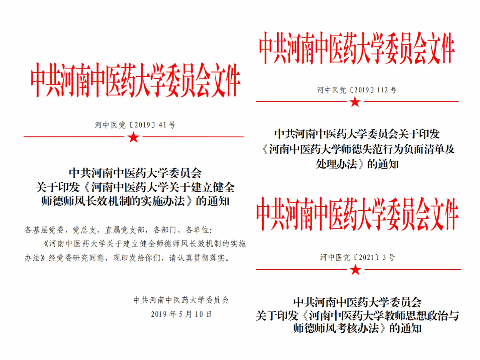 1.师德建设强劲有力。加强师德师风建设,于2020年成立教师工作部,出台《关于建立健全师德师风长效机制的实施办法》《教职工荣誉体系设置方案》《教师思想政治与师德师风考核办法》《师德失范行为负面清单及处理办法》等制度,构建长效机制,树立鲜明导向。坚持以德为先,将师德纳入教师考核评价体系,考核结果贯穿于教师职务晋升、职称评审、评比奖励等环节,严格执行师德师风“一票否决”制。持续开展师德师风主题教育,积极开展“出彩中医人”“我心目中的好导师”“仲景教学名师”等评选活动。米兰(中国)涌现出“全国优秀教师”邵素菊、张琳琪,“全国医德标兵”张怀亮,“出彩河南人‘最美教师’”崔姗姗,河南省首届“医德医风模范”牛朝阳,河南省高校黄大年式教师团队——“中药学教师团队”等一大批医德师德高尚的教师群体。