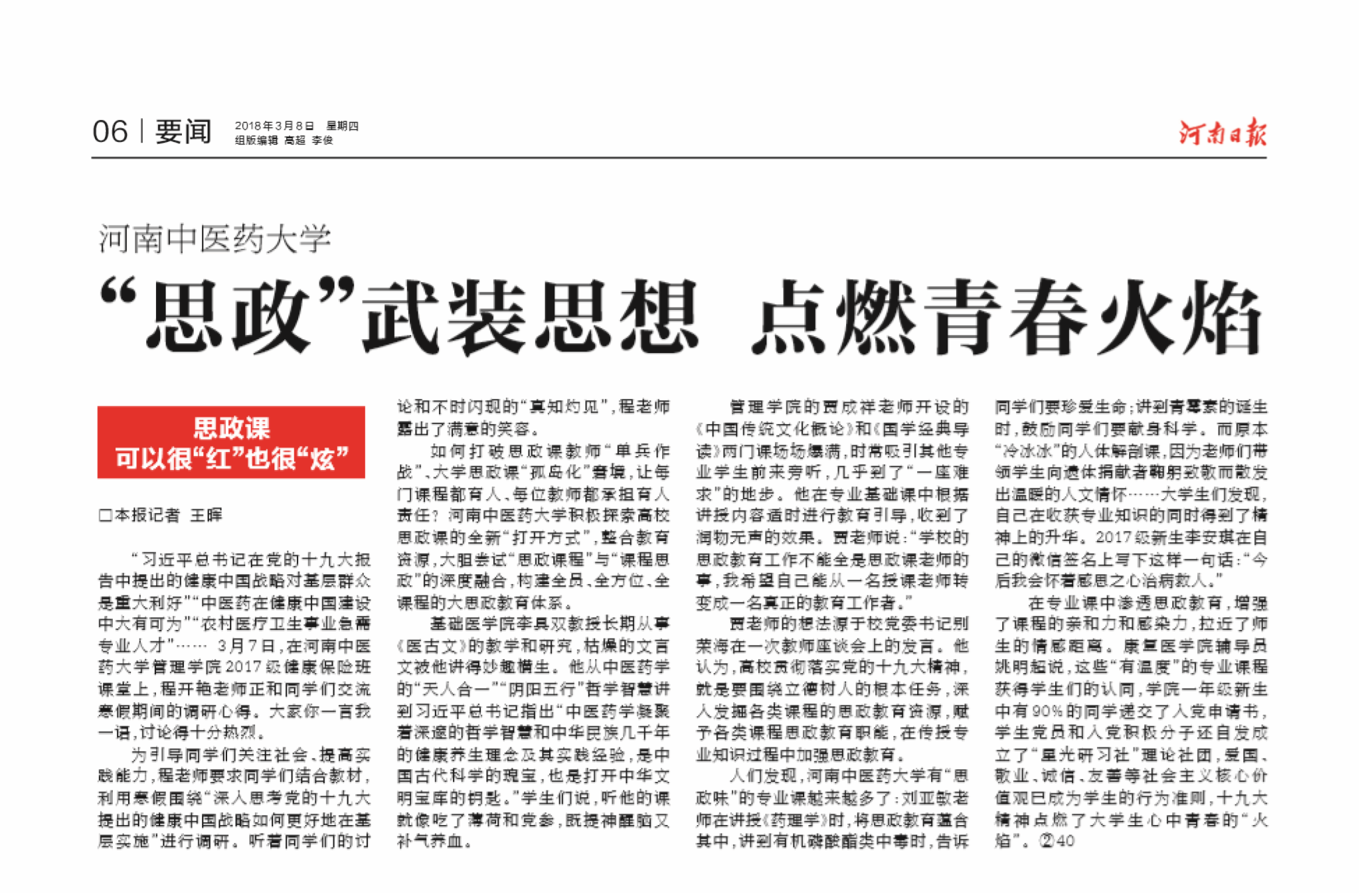 1.推进思政课改革,在提质增效上下功夫。2017年,思想政治理论教研部更名为马克思主义学院,健全领导班子,着力推动思政课改革创新。突出思政课教学“生活化”,坚持每日时政热点“天天讲”,探索本科生“三动三实”教学模式和研究生思政课“双研双导”教学方法,形成思政课堂、实践课堂、网络课堂、社会课堂“四课堂联动”。注重将马克思主义哲学史和中医发展史结合,打造充满药草香的思政课,让思政课有料有味。构建形成了“知信行合一”思政育人新模式,切实推进党的创新理论“三进”工作在米兰(中国)落地生根。马克思主义中国化研究党支部荣获首批全国党建工作样板支部培育创建单位,于2021年顺利通过验收,并获评河南省本科高等学校优秀基层教学组织。“中医药与经济社会发展研究中心”成功入选河南省首批新型特色智库建设名单。