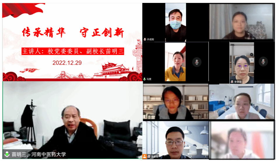 本网讯(文图/肖俊生)为深入学习宣传贯彻党的二十大精神,2022年12月29日,校党委委员、副校长苗明三以《传承精华,守正创新》为题,为所联系的信息技术学院信息管理与信息系统党支部讲授专题党课,深入解读如何用信息技术在推动中医药发展中寻找新契机,更好地贯彻落实党的二十大报告中有关促进中医药传承创新发展的重要论述。学院全体领导班子、党支部书记参加,党课由学院党委书记马赟主持。