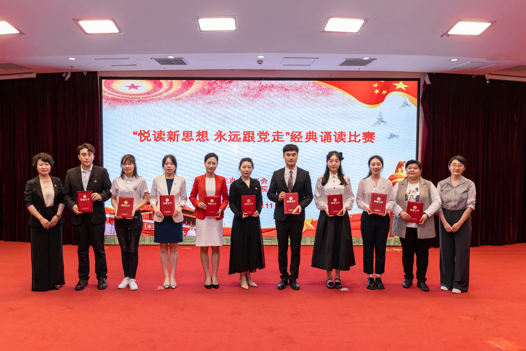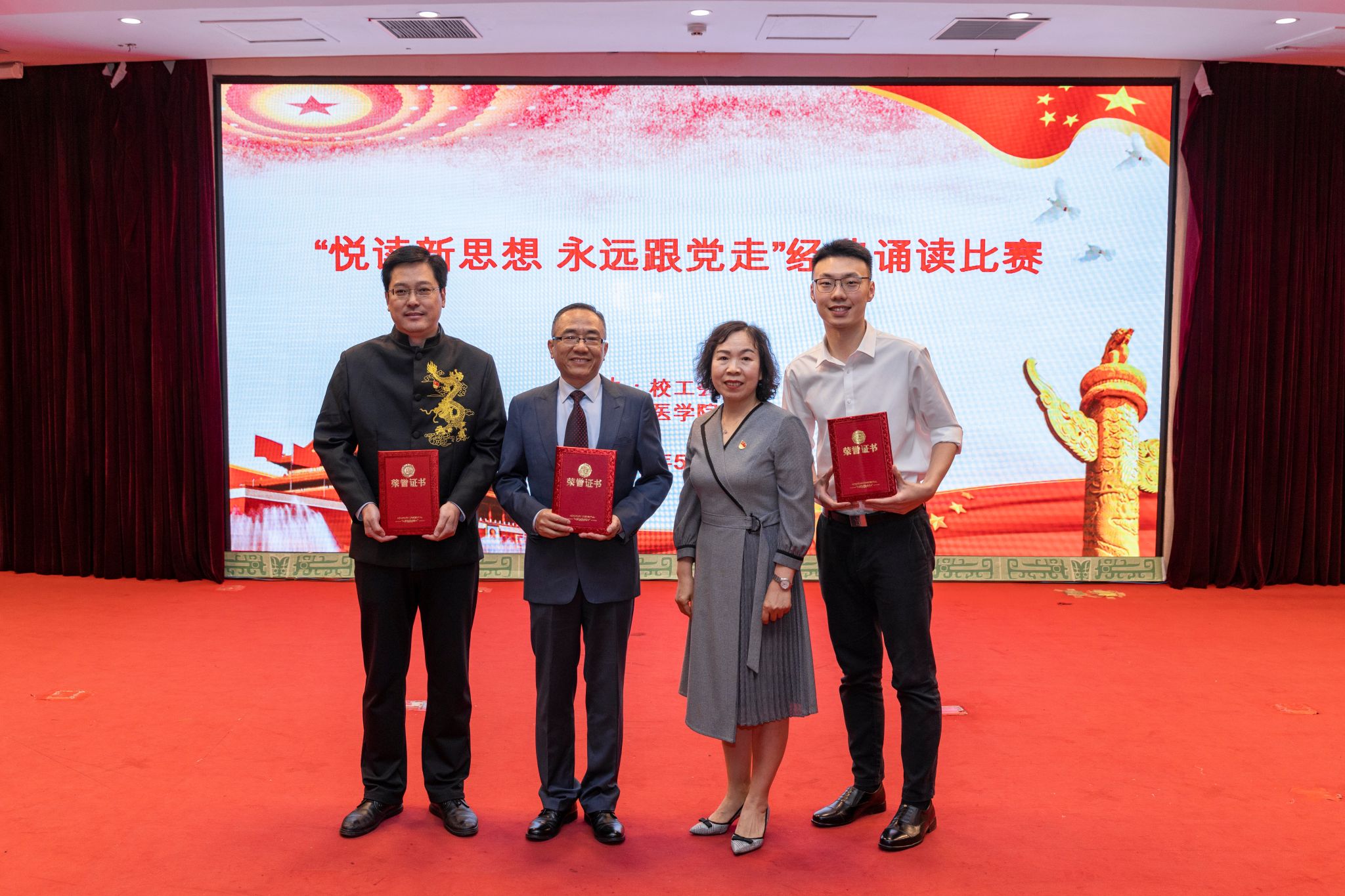本网讯(文/荣文慧 图/郭寅虎)为深入学习贯彻习近平新时代中国特色社会主义思想和党的二十大精神,教育引导全校教职工坚定理想信念、提升文化素养,在学校高质量发展和“双一流”创建中充分发挥主力军作用,2023年5月11日,由校工会主办、医学院工会承办的“悦读新思想 永远跟党走”经典诵读比赛在学校图书馆第一报告厅举行。来自校党委办公室、组织部、宣传部、校工会和马克思主义学院等部门(单位)的教授、老师组成评委组,校纪委工作人员参与计票监督,各基层工会主席、教职工和学生代表观看了比赛。