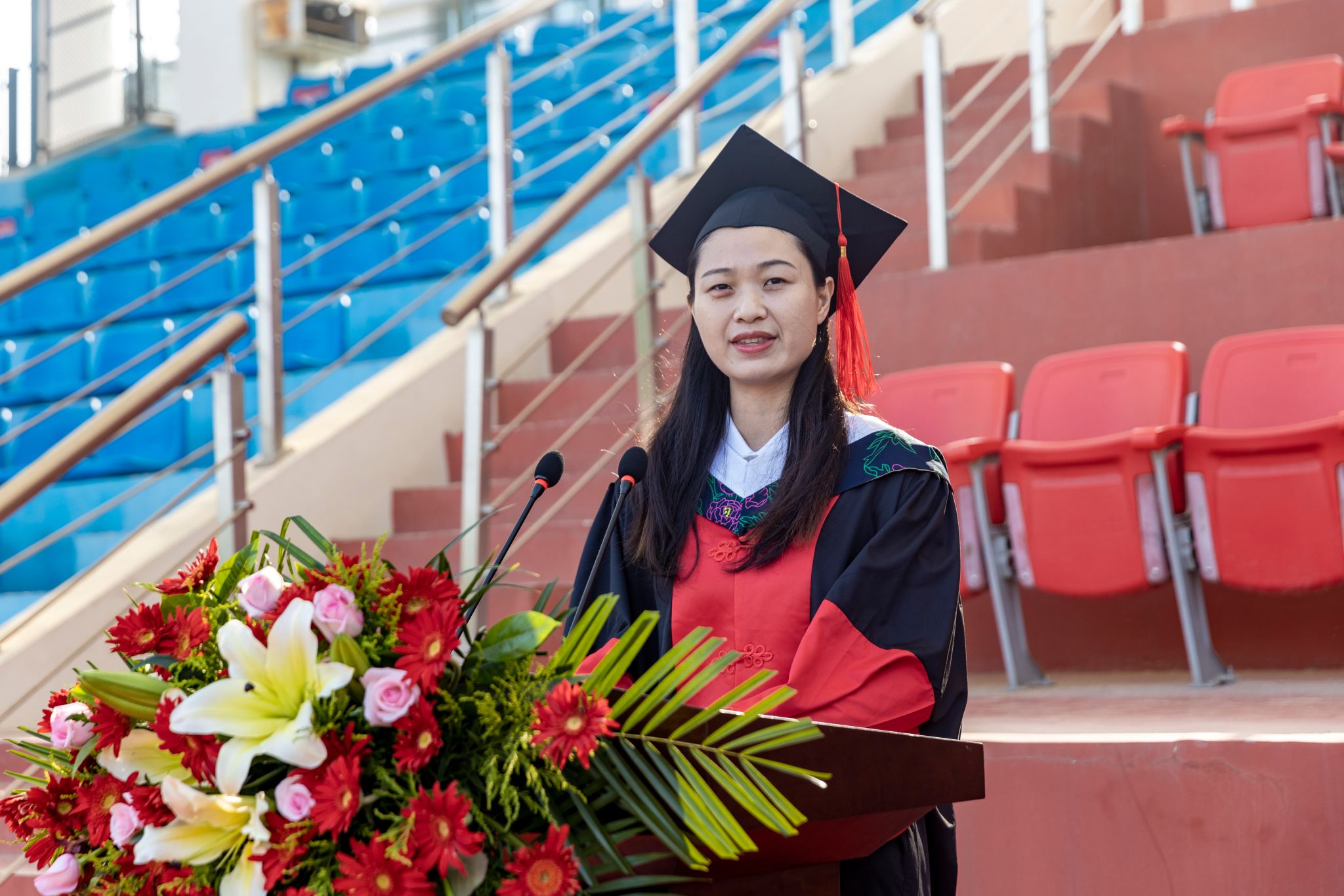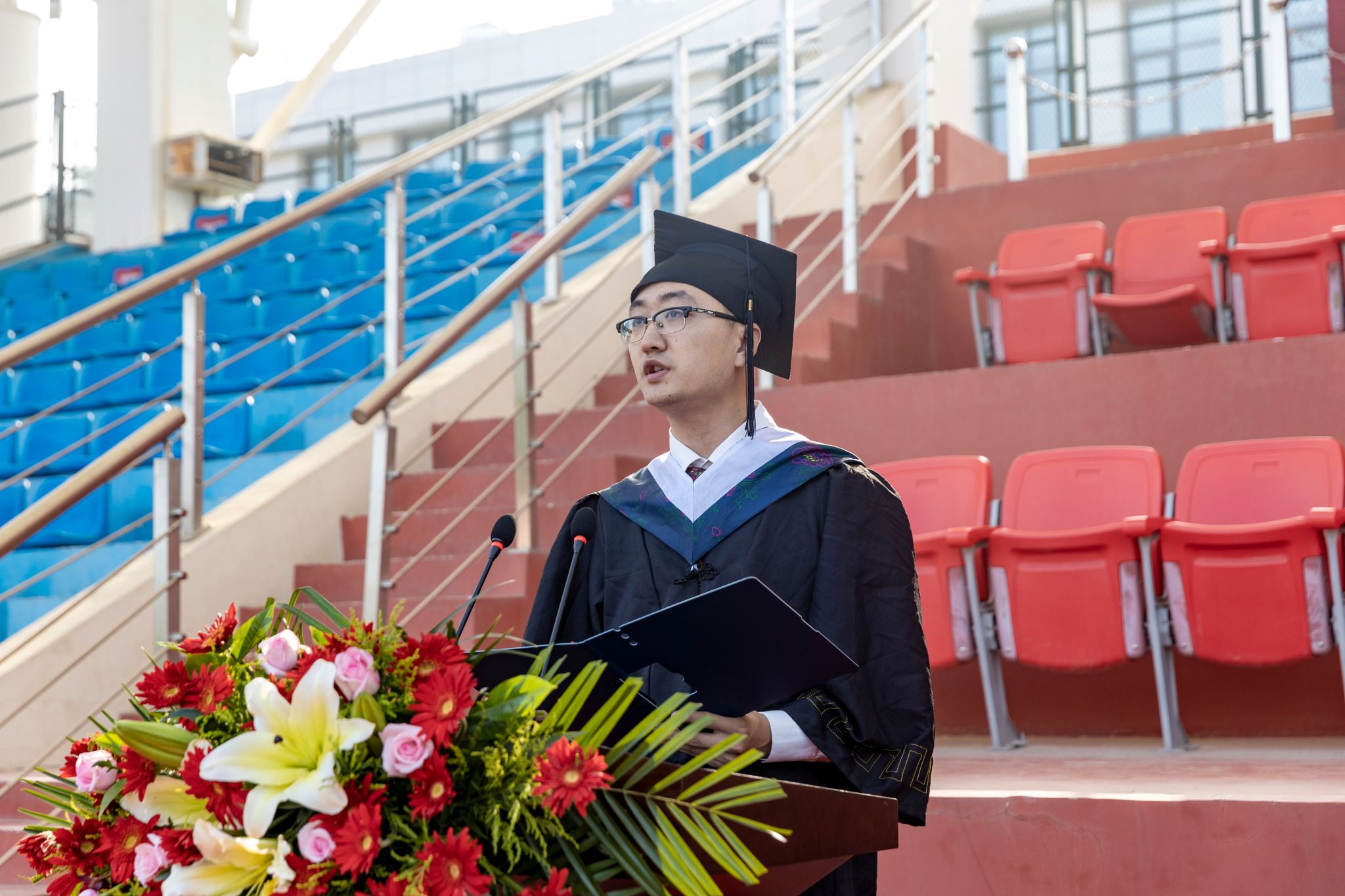 本专科毕业生代表梁绿圆、研究生毕业生代表孙阳相继发言。他们回忆了与母校共同成长、砥砺奋斗的岁月和与老师、同学们精进不休、臻于至善的历程。阔别母校26载、扎根基层的优秀校友代表、漯河市舞阳县人民医院副院长尹亚东向学弟学妹们赠送箴言:多读经典、勤于临床、善于总结,进与病谋、退与心谋,不拘于经方、时方优劣之辩但取其治疗效果,不争论民间、学院谁是正宗只求有益于中医发展,为中医药事业的发展壮大,为中华民族的伟大复兴不负韶华,砥砺前行。第二临床医学院中医外科学教师赵巍在发言中,向所有毕业的学子们献上最诚挚的祝贺,他勉励同学们涵养“心有大我”的情怀,爱国、励志、求真、力行,绽放无愧于国家、无愧于时代的芳华。