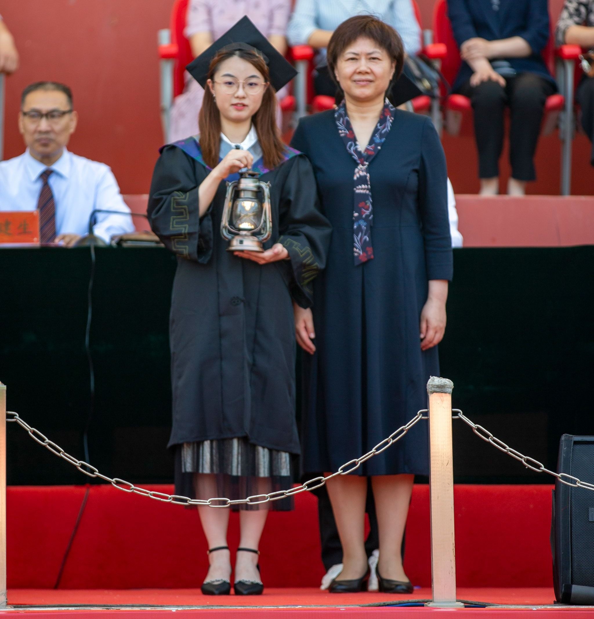 校党委书记李小芳为毕业生代表赠送纪念品——一盏现代化的马灯,警示毕业生不忘选择医学、救死扶伤的初心。古代中医弟子学成出师之时,老师要向学生赠予一盏马灯和一把黄油伞,提醒学子行医之路要风雨无阻,不分昼夜。这份珍贵的礼物还蕴含着母校对毕业生们“传承精华守正创新”的深切希冀,为即将离开母校的同学们点亮了理想之灯,照亮了前行之路。