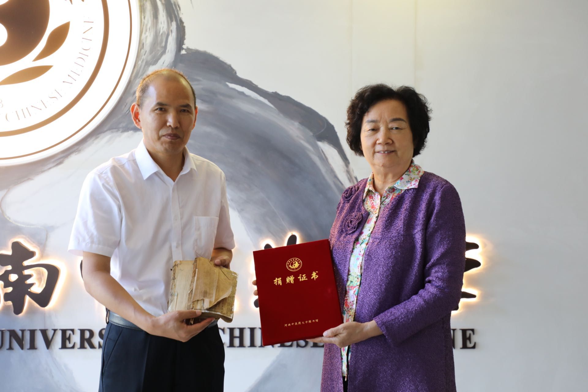 雷天锋代表图书馆接受了捐赠图书并向徐玉芳教授颁发捐赠证书。他对徐玉芳教授退休后仍念念不忘学校发展、关心图书馆建设表达了感谢,并请徐玉芳教授代为转达对全宏勋先生的感谢。他表示一定会紧锣密鼓推进古籍修复工作,做好保存和传承,充分发挥其学术价值。