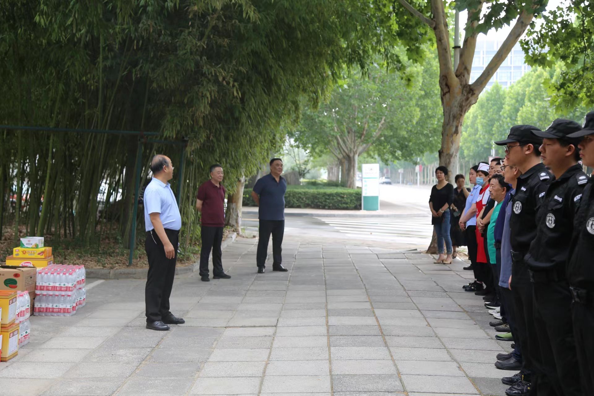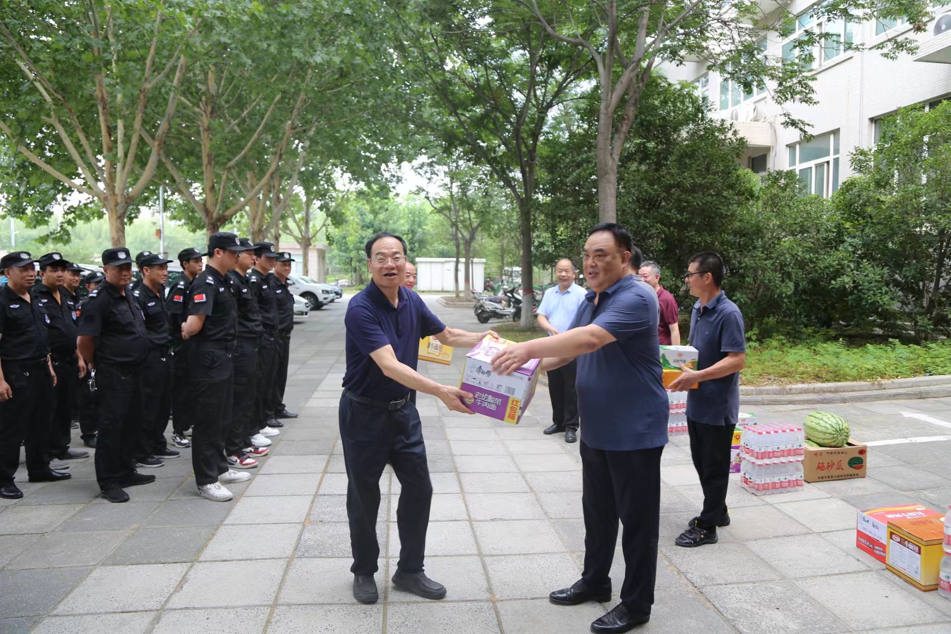 每到一处,校领导与大家亲切交谈并送上消暑慰问物品,对大家的敬业精神和辛勤付出表示衷心的感谢。在小综合楼,苗明三向后勤员工和武装保卫处人员详细了解暑期餐食供应和校园出入管理等情况。“烈日炎炎,大家依然坚守岗位,竭力维护校园安全稳定,我们代表学校向大家表示衷心感谢!”张小平嘱咐大家在保质保量完成工作任务的同时要劳逸结合,做好防暑降温工作,以更加健康的体魄、更加饱满的热情为学校高质量发展贡献力量。