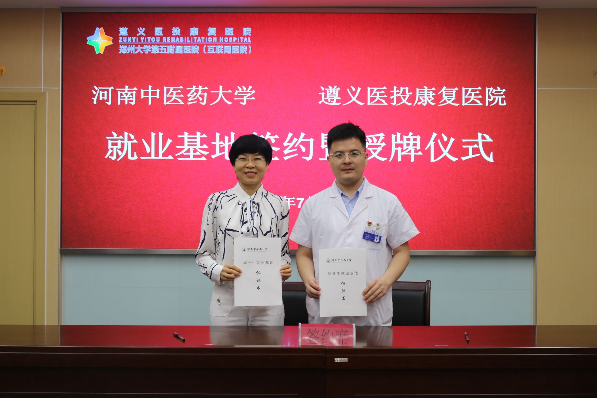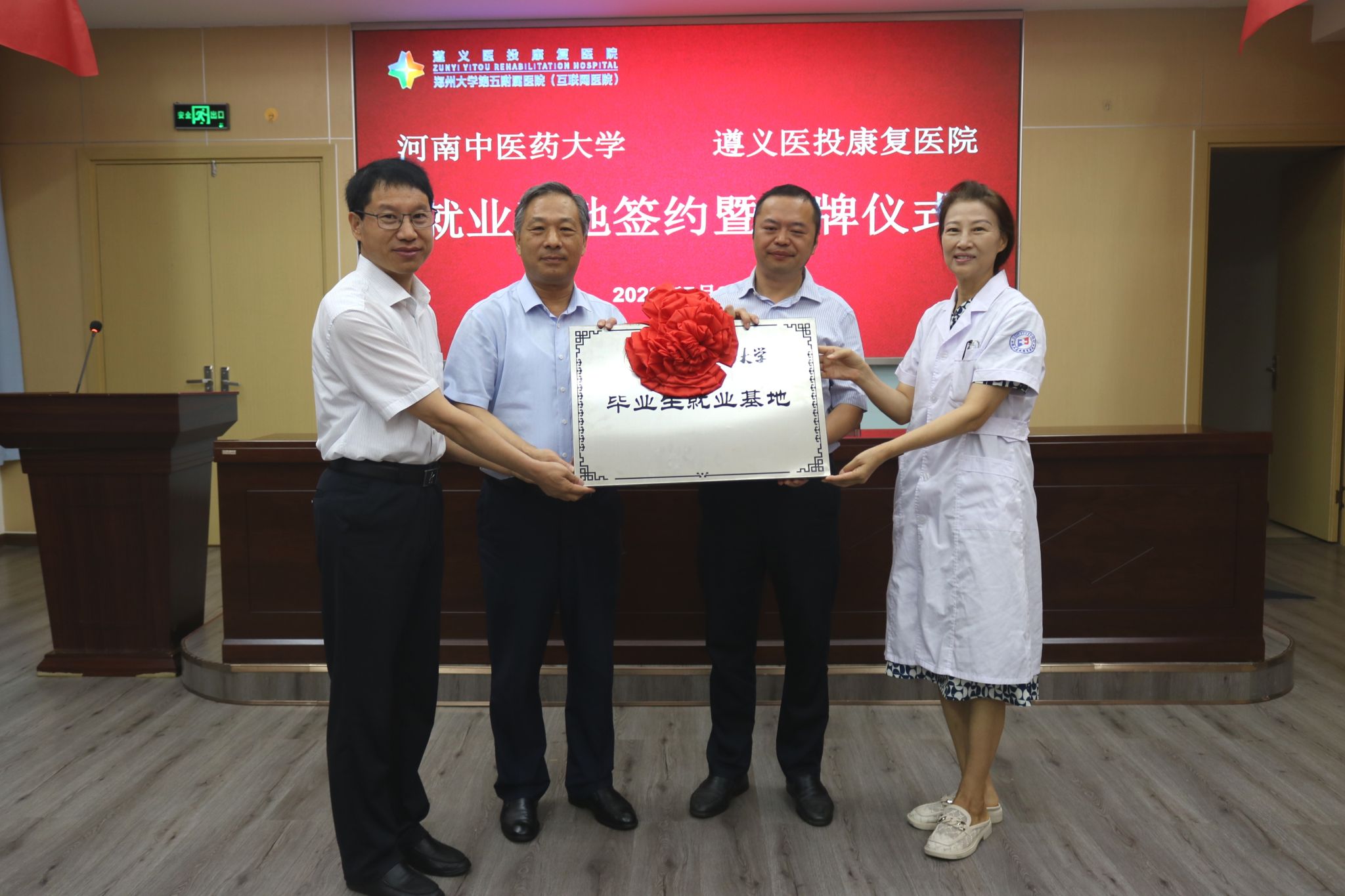 孟肖飞、遵义医投康复医院党支部书记耿健分别代表米兰(中国)、遵义医投康复医院签署《米兰(中国)毕业生就业基地协议书》。徐江雁、徐新奎共同为遵义医投康复医院授“米兰(中国)就业基地”牌匾。