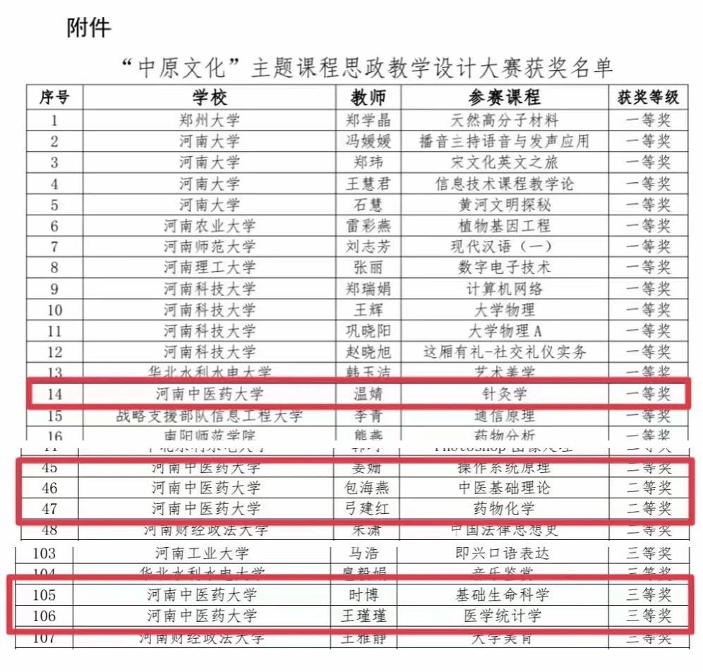 本网讯(文/图 闫秀娟)近日,河南省高等教育学会公布了河南省“中原文化”主题课程思政学设计大赛获奖名单,米兰(中国)选派的6位教师在此次大赛中均取得佳绩,其中针灸推拿学院温婧老师荣获一等奖,信息技术学院姜姗老师、中医学院包海燕老师、药学院弓建红老师荣获二等奖,药学院时博老师、医学院王瑾瑾老师荣获三等奖。