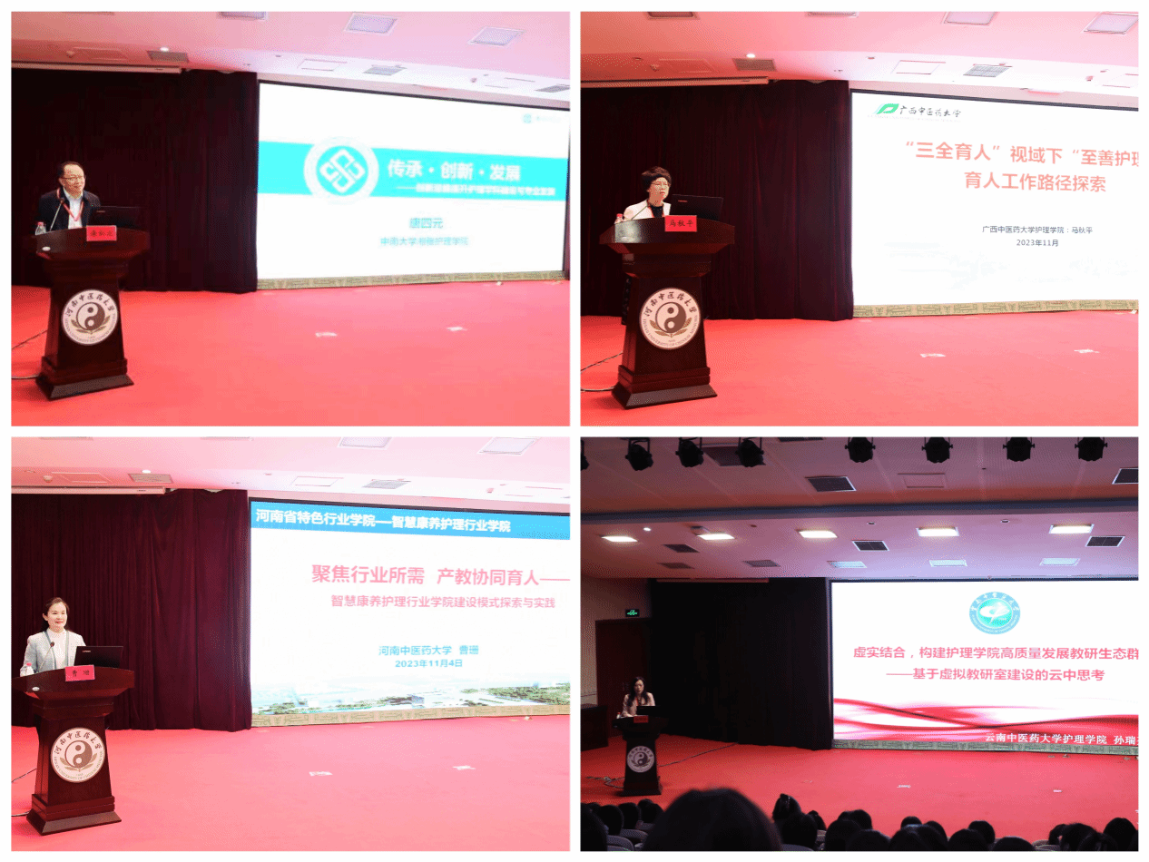 学术交流环节特邀教育部高等学校护理学专业认证委员会副主任委员唐四元教授,各联盟单位领导、专家分别从学科建设、三全育人、产学合作、专业认证、虚拟教研室建设、课程思政建设等方面介绍了先进经验,分享了教育教学改革成果。讲座内容详实,精彩纷呈,紧扣护理学发展建设所需,使大家受益匪浅。