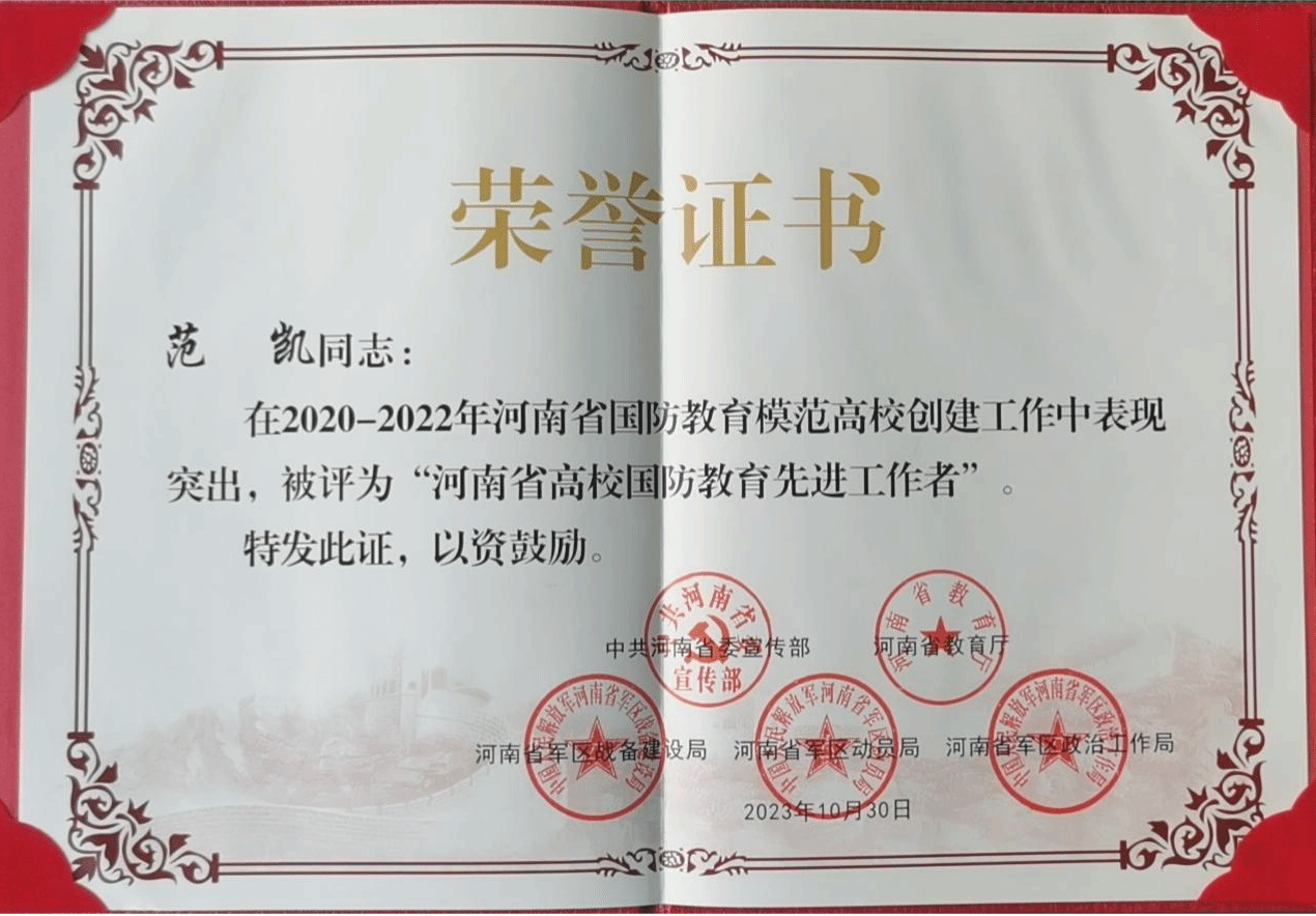 自2020年河南省委宣传部,河南省教育厅,河南省军区战备建设局、动员局、政治工作局部署开展“河南省国防教育模范高校”创建活动以来,在校党委的坚强领导下,在学校各部门齐抓共创和通力协作下,校武装部以习近平新时代中国特色社会主义思想和习近平强军思想为指导,以全面落实立德树人根本任务和发挥国防教育综合育人功能为目标,不断在工作实践中加强和改进米兰(中国)国防教育、兵役征集、学生军训、退役学生管理和武装部建设工作,在国防教育新模式、新方法上下功夫、用力气,突破创新、力争实效,为提升米兰(中国)国防教育教学水平和教育质效,推动米兰(中国)国防教育工作的正规化、规范化建设作出了不懈的努力。三年来,在县(区)初评、省辖市测评和省评定委员会审核等环节的严格评测中,米兰(中国)连续三年被评为优秀并首批获得“河南省国防教育模范高校”荣誉称号。