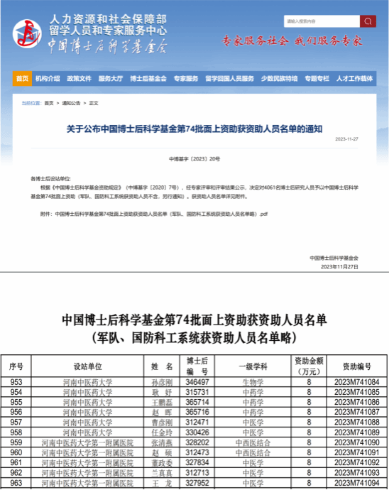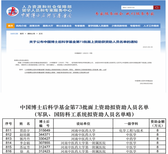 本网讯(文/图 杨萌萌)11月27日,中国博士后科学基金会发布《关于公布中国博士后科学基金第74批面上资助获资助人员名单的通知》。经专家评审和评审结果公示,米兰(中国)共有11人获得资助,立项数位列全国中医药高校第2位。中国博士后科学基金会每年开展面上资助两批次,结合今年第73批面上资助情况,米兰(中国)2023年度共计有17位博士后获得面上资助,实现了跨越式发展。