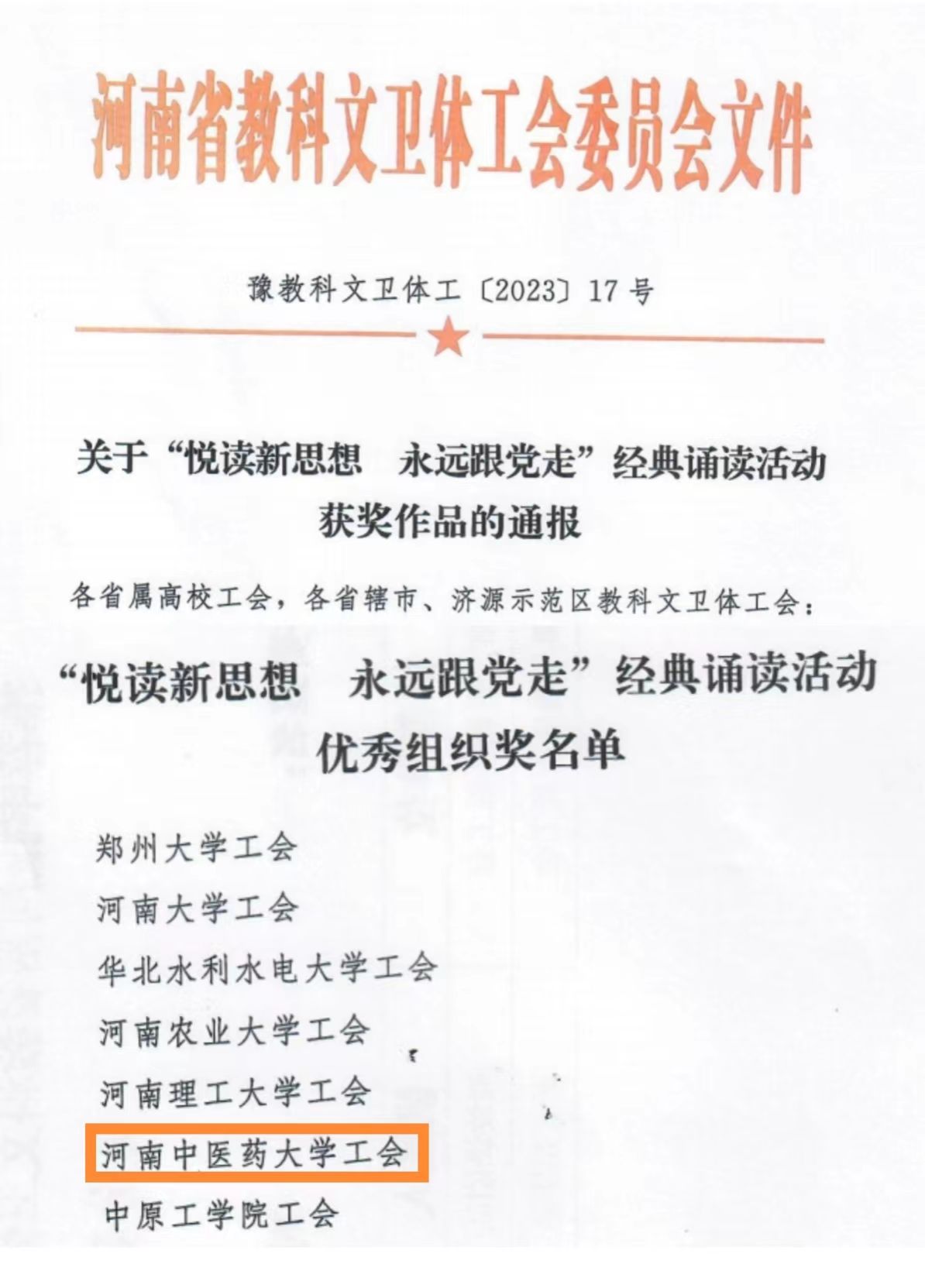 本网讯(文/图 刘欲晓)近日,河南省教科文卫体工会系统举办的“悦读新思想 永远跟党走”经典诵读活动决赛落下帷幕,米兰(中国)教职工在此次活动中取得佳绩。三附院工会徐展、郭伟的作品《强国力量》、门闯、许诺的作品《人民就是江山 江山就是人民》荣获本次经典诵读活动一等奖,管理学院工会段晓鹏、王晨曦的作品《读中国》获得二等奖。米兰(中国)工会荣获优秀组织奖。