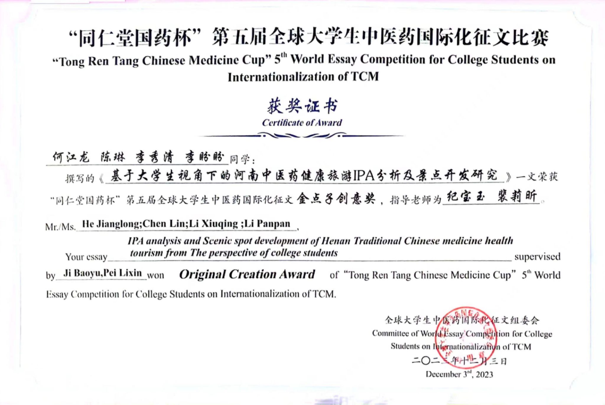全球大学生中医药国际化征文大赛已经连续举办五年。五年来,活动覆盖了30多个国家和地区,吸引了来自70余所院校,1600多名选手参赛。第五届全球大学生中医药国际化征文比赛由世界针灸学会联合会和上海中医药大学中医药国际化发展研究中心联合举办,活动历时6个月,吸引多个国家和地区30余所院校近200位选手参与,经过激烈角逐,共有26位选手晋级风采赛道和创意赛道决赛。该参赛论文由河南省中医药文化与管理研究项目(《河南中医药健康旅游的优势与模式研究》)资助支持,将中医药文化传播和健康旅游发展相结合,详细论述了中医药健康旅游的发展背景、产业内涵和前景展望,并具体以河南省为例,提出了中药健康旅游产业的针对性发展策略和建议,该论文以其较高的创新性和实用性顺利通过初赛专家审核、复赛论文复审和网络投票,最终在决赛现场答辩中脱颖而出,获评创意赛道“金点子创意奖”。