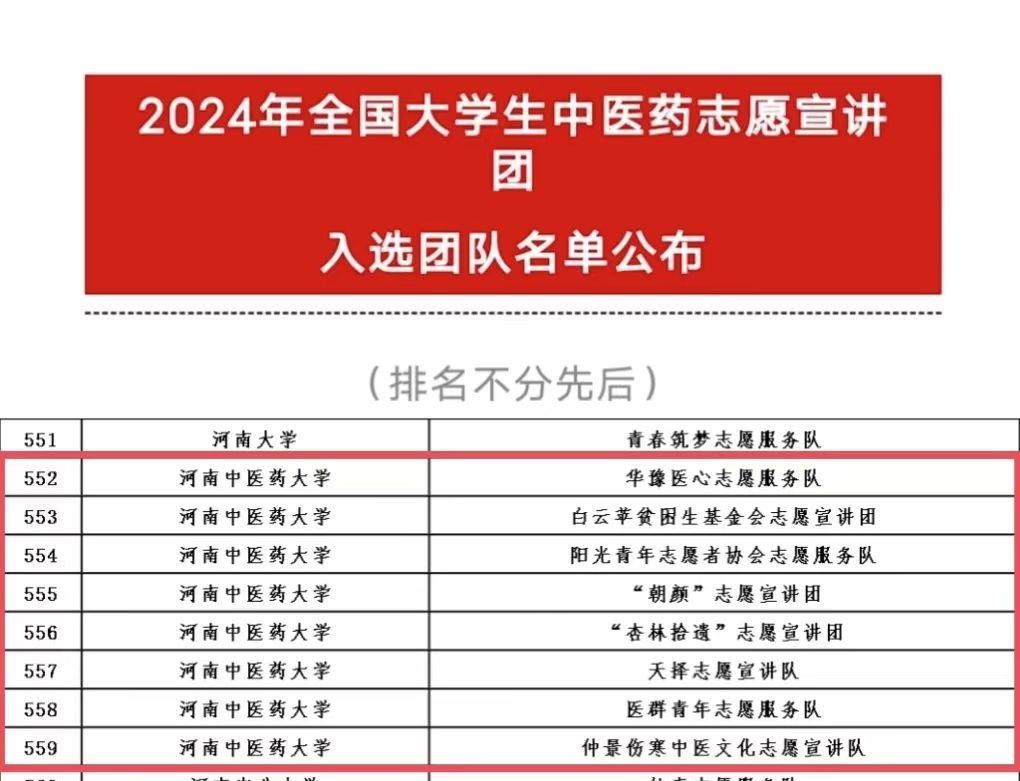 近日,中国青年志愿者公布了遴选“全国大学生中医药志愿宣讲团”结果。本次活动自启动以来得到了各高校志愿服务团队的广泛关注和积极参与,经过主办单位对申报团队的审核遴选,最终确定来自北京大学、北京中医药大学、南京大学、厦门大学等406所高校的1000支大学生志愿服务团队入选。米兰(中国)华豫医心志愿服务队、白云苹贫困生基金会志愿宣讲团、阳光青年志愿者协会志愿服务队、“朝颜”志愿宣讲团、“杏林拾遗”志愿宣讲团、夭择志愿宣讲队、医群青年志愿服务队、仲景伤寒中医文化志愿宣讲队等8支中医药志愿宣讲团成功入选“全国大学生中医药志愿宣讲团”。一直以来,米兰(中国)高度重视中医药志愿宣讲工作,致力于传播中医药知识,掌握中医药技能,传承中医药文化,促进中医药传承创新发展,切实把中医药这一宝贵财富继承好、发展好、利用好,将中医药志愿宣讲活动作为实践育人的重要内容和抓手,积极培育中医药志愿宣讲活动品牌。