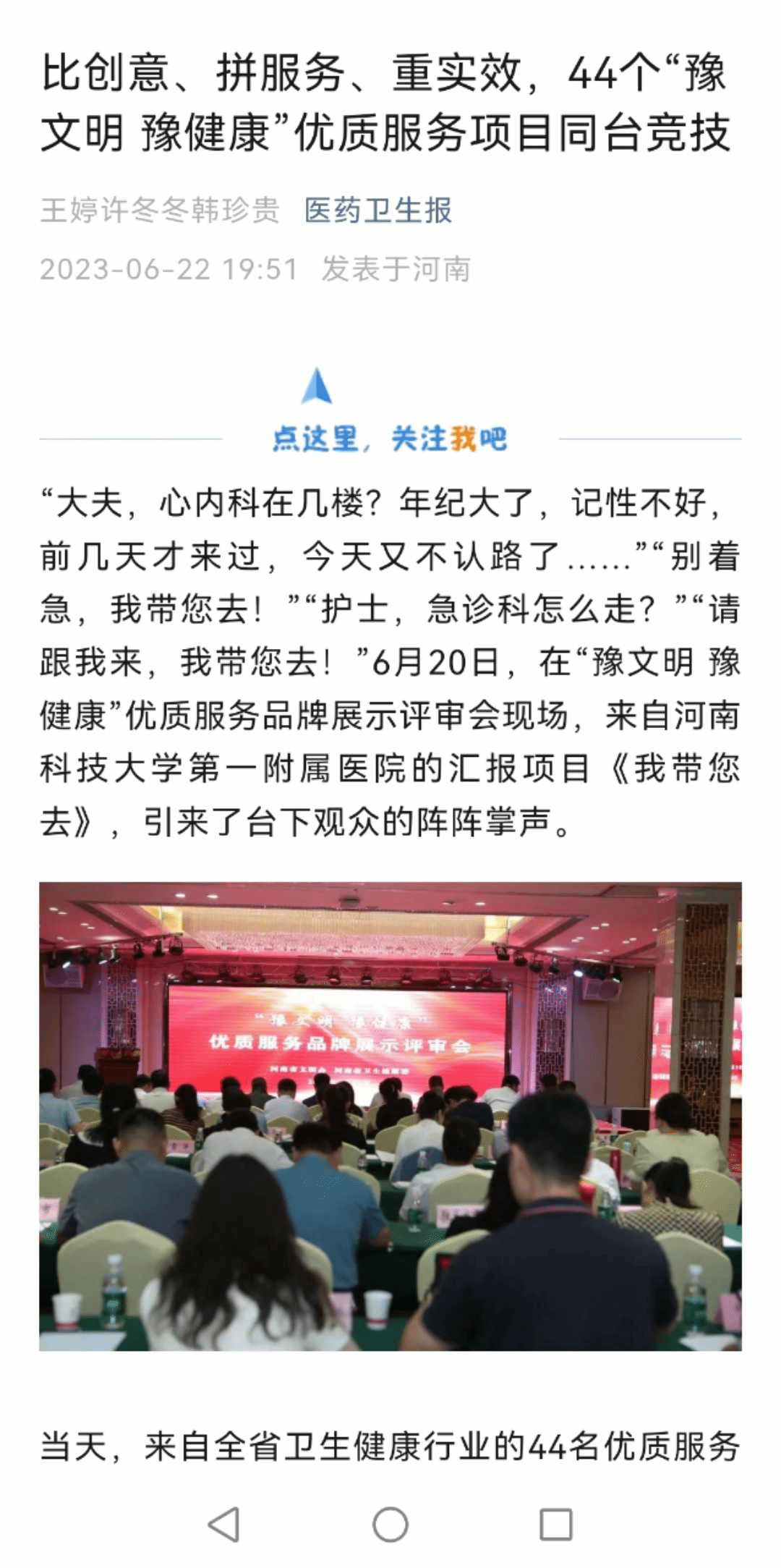 (文图/杜可林)比创意、拼服务、重实效,44个“豫文明 豫健康”优质服务项目同台竞技。2023年6月20日,由河南省文明办、河南省卫生健康委举办的“豫文明 豫健康”优质服务品牌展示评审会在郑州召开。经前期申报和初评,一附院“延泰先锋”志愿服务品牌入围终评环节。医院党委副书记张婉红带队参加,并代表医院进行汇报。来自于全省各医疗卫生机构的44个品牌项目现场竞争,经过激烈角逐,一附院“延泰先锋”志愿服务品牌最终进入评审前三名。《医药卫生报》对其进行报道,并将一附院汇报作为重点内容。